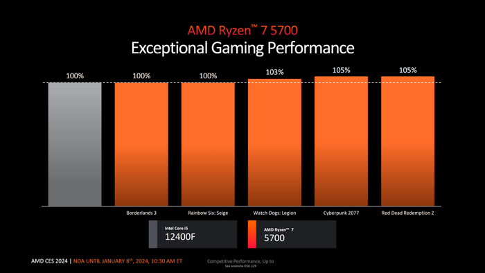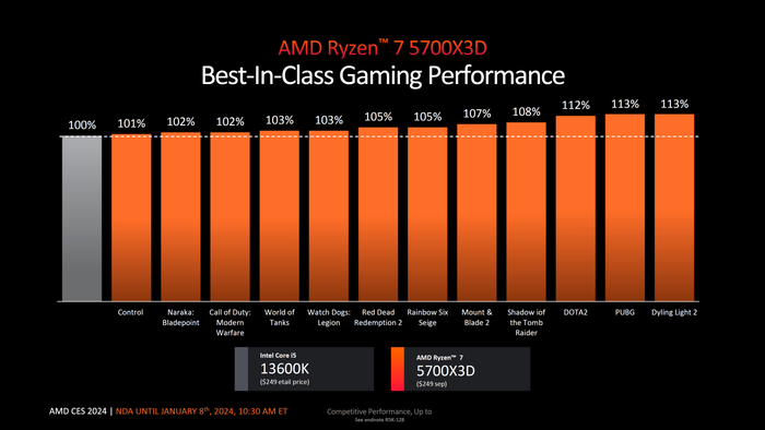 AMD đã khẳng định rằng, so với Core i5-13600K cùng tầm giá, Ryzen 7 5700X3D có thể mạnh hơn lên đến 13% ở độ phân giải 1080p trong các thử nghiệm với Dying Light 2. Điều này có nghĩa là, nếu những thông tin quảng cáo là đúng, hiệu suất gaming của CPU có giá 249 USD này sẽ không kém cạnh Core i9-13900K.