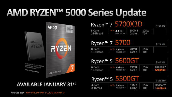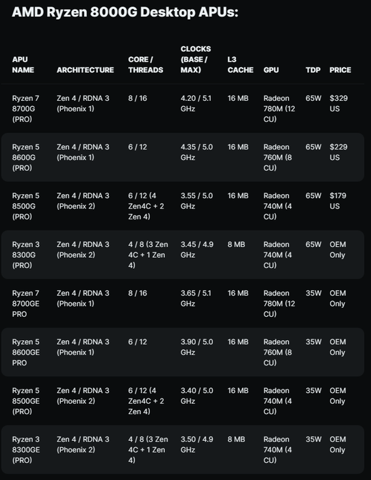 Dưới đây là các thông số kỹ thuật của ba chip Ryzen 8000 mà bạn có thể mua từ ngày 31/1/2024.