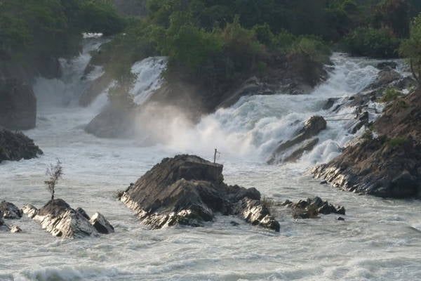 Sau khi vượt qua biên giới Campuchia, chúng tôi đến Khone Phapheng - thác nước lớn nhất Đông Nam Á, chia làm đôi bởi sông Mekong, thuộc hai tỉnh Champasak và Strung Treng của Campuchia. Dòng nước cuồn cuộn, bọt trắng phát ra, âm thanh của thác nước vang vọng từ trên cao. Bờ sông che phủ bởi những khu rừng rậm. Champasak còn nhiều thác nước hùng vĩ như vậy.
