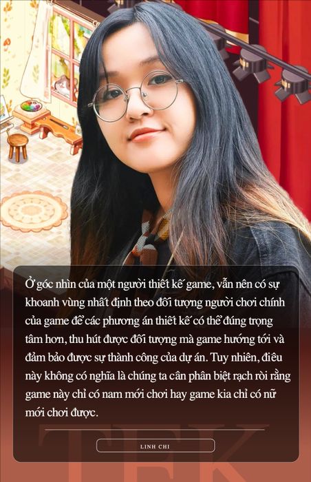 Linh Chi chia sẻ rằng 10 năm trước, khi mới bắt đầu nghề, không nhiều studio game tại Việt Nam quan tâm đến phát triển trò chơi dành cho nữ, phần lớn game vẫn chỉ chú trọng các thể loại như đối kháng, nhập vai, dành cho nam giới, khiến cơ hội cho nữ thiết kế game khá hạn chế do định kiến giới.