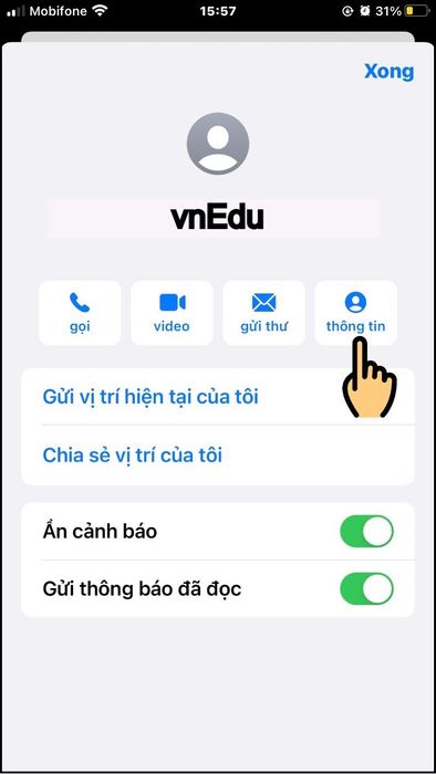 - Nhấn vào tên liên hệ > Chọn biểu tượng chữ i màu xám.