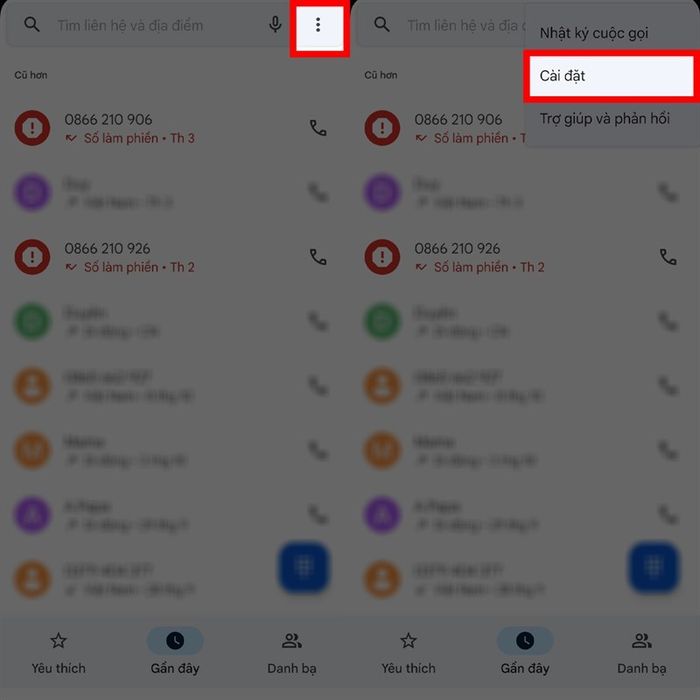- Bạn vào Điện thoại > Chọn biểu tượng ba dấu chấm ở góc trên bên phải > Nhấn Cài đặt.
