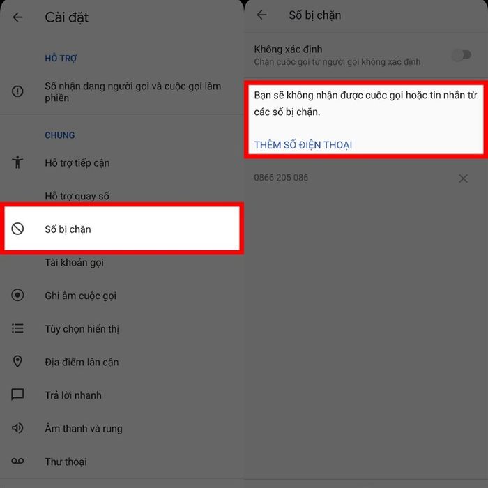 Bước 2: Trong phần cài đặt, bạn hãy chọn vào mục Số bị chặn. Để chặn một số điện thoại, chọn Thêm số điện thoại.