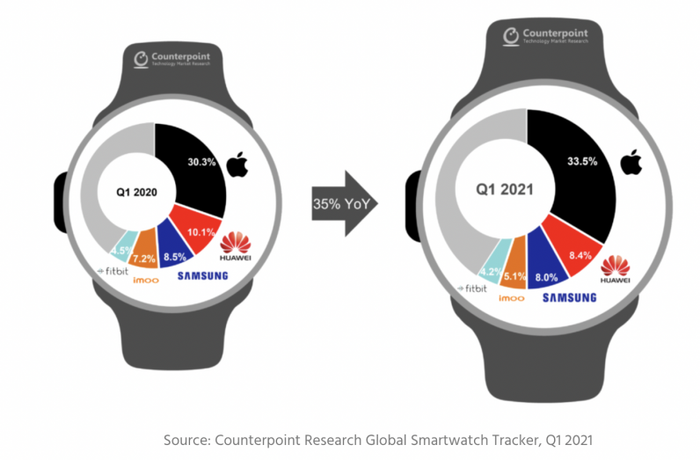 Q1 2021 smartwatch tracker by CounterpointChiếc đồng hồ đồn đoán của Google với 'các tính năng thể dục cơ bản' không tạo nên nhiều niềm tin khi đối đầu với Apple Watch. Thậm chí, tôi đang sử dụng Mi Band 6 giá 46 đô la, và nó cũng có các tính năng thể dục cơ bản đủ cho nhiều người dùng.