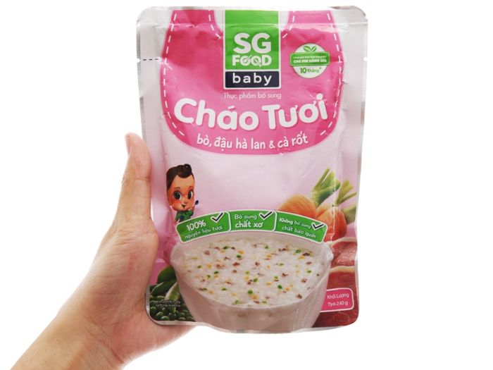Tất cả sản phẩm của SG Food đều được làm từ nguyên liệu tươi sạch, mẹ có thể hoàn toàn yên tâm khi chọn cháo từ SG Food cho bé yêu. Cháo SG Food có nhiều hương vị, đặc biệt là vị bò, đậu hà lan, cà rốt và vị bò, đậu đỏ, được rất nhiều bé yêu thích với hương vị tươi ngon, giữ nguyên dinh dưỡng như cháo mới nấu.