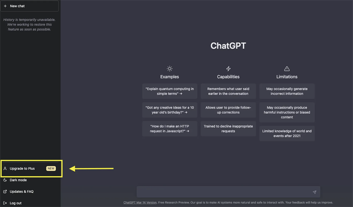 Bước 2: Trong giao diện ChatGPT, chọn "Nâng cấp lên Plus" ở thanh bên phải và bạn sẽ chuyển đến bước tiếp theo.