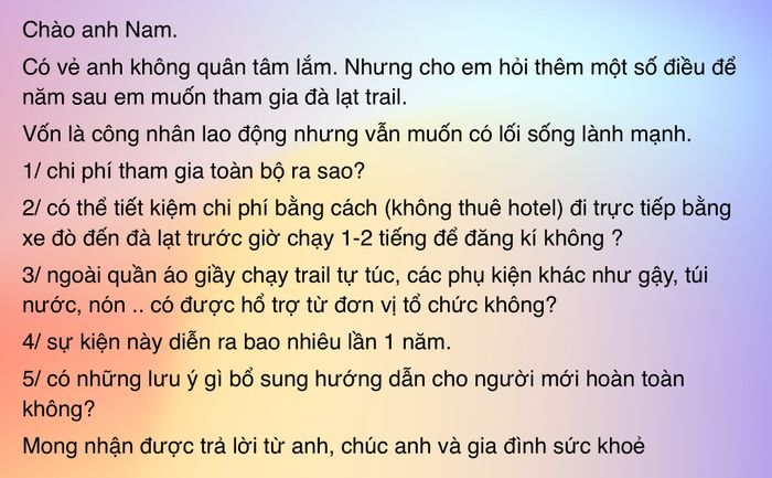 Để tiết kiệm chi phí, bạn có thể tự đi trực tiếp đến sự kiện mà không cần thuê khách sạn. Tuy nhiên, bạn cần phải đăng ký mua vé từ trước, vì thông thường các giải chạy sẽ đóng cửa đăng ký khoảng 2-3 tuần trước ngày diễn ra.Câu hỏi 3: Ngoài quần áo và giày chạy trail tự túc, liệu có nhận được sự hỗ trợ từ đơn vị tổ chức về các phụ kiện như gậy, túi nước, nón,... không?
