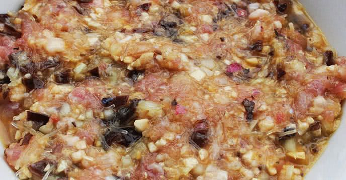 Trộn đều hành, nấm, và thịt băm. Thêm 2 quả trứng, tiêu, ½ thìa café nước mắm, nêm, rồi trộn đều tất cả.