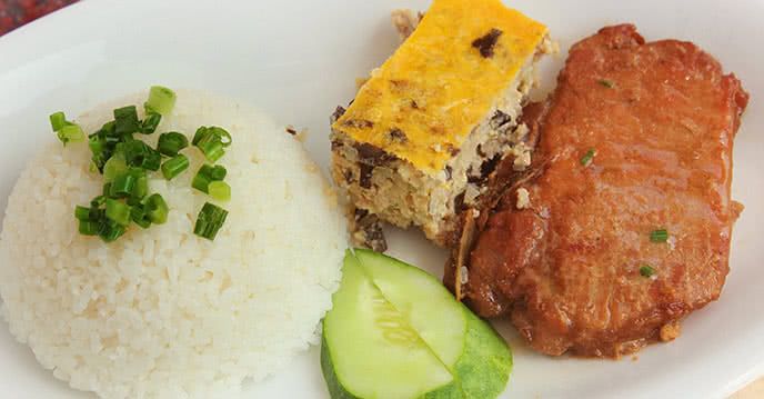 Món chả trứng thường kết hợp với cơm tấm và thịt quay xá xíu, thêm chút hành chưng mỡ thơm làm cho mọi người mê mẩn.