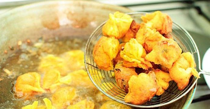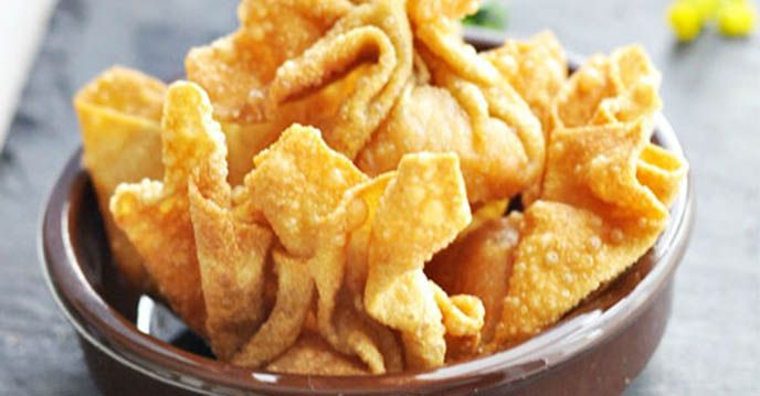 - Chiên giòn 2 lá hoành thánh, bóp nhỏ và trộn cùng hỗn hợp.