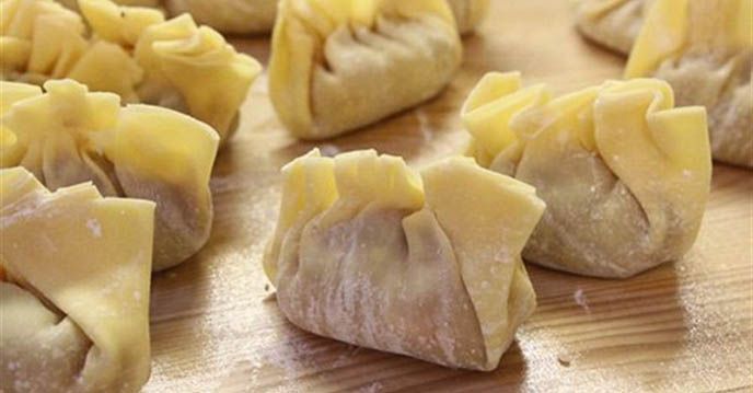 - Cho 1 thìa cafe nhân đầy vào vỏ hoành thánh, túm lại, và dán mí với một ít nước trộn bột năng. Không nên làm to quá, khi ăn sẽ mất ngon.