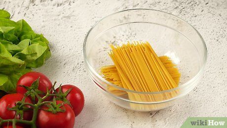 Bẻ mì spaghetti và đặt vào bát an toàn trong lò vi sóng. Lấy lượng mì spaghetti theo ý muốn. Bẻ mì thành đôi hoặc ba và đặt vào bát an toàn trong lò vi sóng.