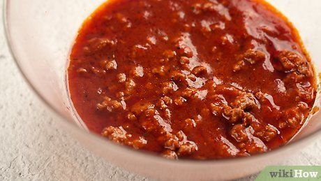 Thêm cà chua, nước, viên súp và lá oregano vào, đảo đều. Mở hộp cà chua băm 400 g và trút hết vào bát thịt trộn rau củ. Rót thêm 4 thìa canh (60 ml) nước sôi, 1 thìa cà phê (2 g) lá oregano khô, 1 viên súp bò hoặc 1 thìa cà phê (2,5 g) bột súp.