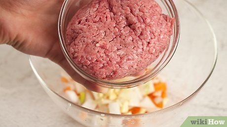 Trộn 300 g thịt bò nạc xay với rau củ trong bát. Trộn thịt với rau củ đã cắt nhỏ, vừa trộn vừa dầm nhỏ thịt. Như vậy thịt bò sẽ chín đều.