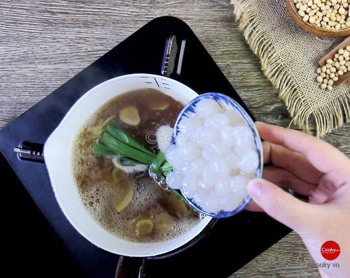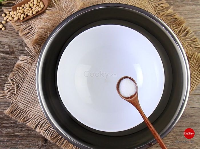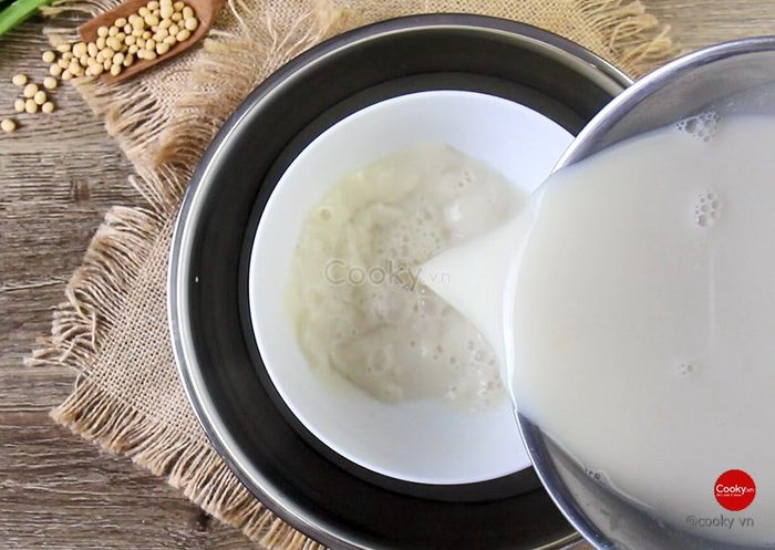 – Đem đậu nành ngâm trong nước trong 8 tiếng, sau đó vớt ra và rửa sạch. Đặt đậu vào máy xay sinh tố, thêm nước đến mức bám đều lên mặt đậu (1.2 lít) và xay nhuyễn. Sau khi xay nhuyễn, hãy sử dụng rây và một tấm vải sạch để lọc sữa đậu nành. Hãy đổ phần sữa đã lọc vào nồi cùng vài lá dứa, sau đó đun sôi ở lửa vừa.