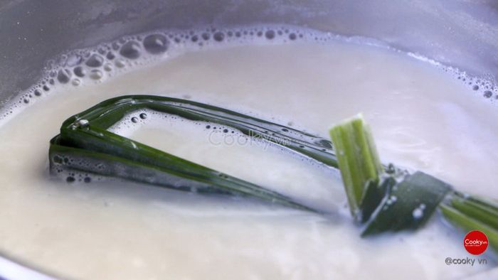 Đổ sữa đậu nành vào nồi, thêm 5 lá dứa, đun nhỏ lửa cho đến khi sữa sôi trong vòng 3 phút, sau đó tắt bếp.