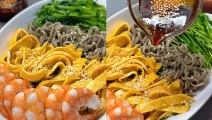Đây là một công thức sáng tạo dựa trên mì kiều mạch. Mì kiều mạch giàu chất xơ và thấp calo, đặc biệt khuyến khích trong giai đoạn giảm béo! Sau khi luộc mì kiều mạch, tôm và rau củ, chiên một quả trứng và dùng nước tương, dấm, tương ớt hoặc dầu ớt làm nước chấm mì. Trộn đều các nguyên liệu, hương vị cao với protein và carbohydrate chất lượng. Bữa ăn không chỉ ngon miệng mà còn sảng khoái, không nặng nề. Đặc biệt khuyến khích trong thời kỳ giảm béo!