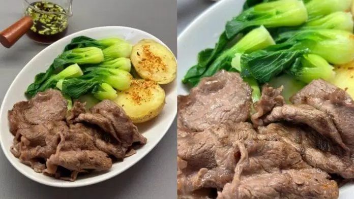 Gân bò áp chảo + khoai tây hấp + rau luộc
