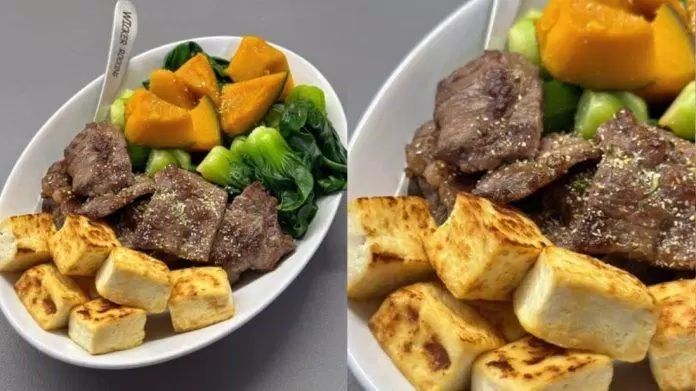 Món chính là bít tết, thêm một chút dầu ôliu để chiên nhẹ đến chín vừa. Dùng phần dầu còn lại để chiên đậu phụ tạo cảm giác no. Bí ngô hấp là nguồn carbohydrate, ăn kèm với ít nước luộc bí. Nếu lười, bạn có thể nướng bít tết và bí ngô trực tiếp trong lò, thưởng thức món ăn ngon và nhẹ calo, carbohydrate thấp.
