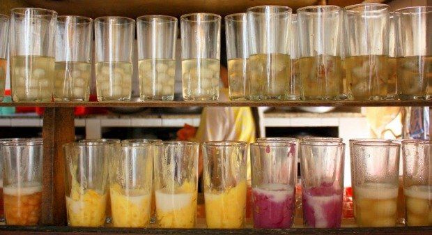 Dấu nhận diện của quán là những dãy ly cao, mỗi chiếc tựa nhau, chờ sẵn lòng đón đựng chè lạnh. Nồi chè nấu sẵn với đủ màu sắc rực rỡ như tím, đỏ, vàng, tạo nên bức tranh màu sắc quyến rũ mọi vị giác.