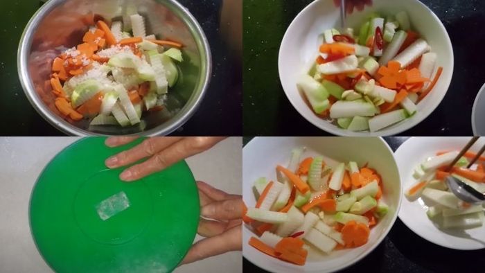 Cách Làm Su Hào Muối XổiĐặt su hào, cà rốt, tỏi nghiền, ớt băm, 1 muỗng canh đường, 1 muỗng canh muối, 1 muỗng canh giấm và 1 muỗng canh nước mắm vào trộn đều trong 1 tô.