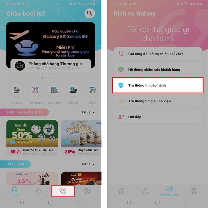 Bước 3: Kiểm tra thông tin bảo hành Samsung tại ứng dụng Quà tặng Galaxy. Hãy tải ứng dụng từ Google Play và mở nó. Chọn mục Dịch vụ Galaxy và tiếp theo là Tra cứu thông tin bảo hành. Ô nhập IMEI sẽ xuất hiện, hãy điền đúng số vào ô để kiểm tra thông tin bảo hành.