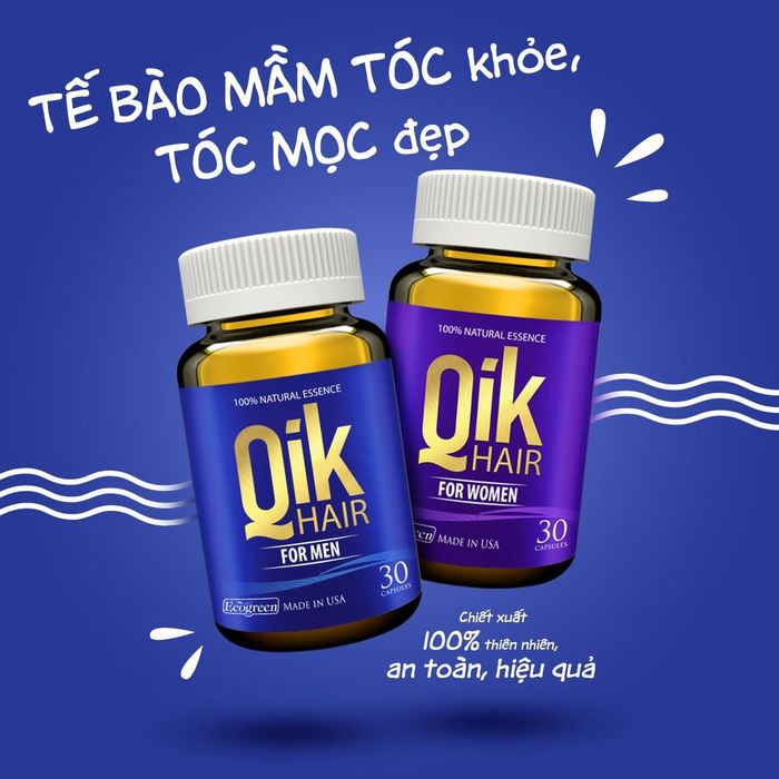 Viên uống QIK HAIR với thành phần tự nhiên giúp giảm rụng tóc, duy trì độ ẩm cho da đầu, ngăn chặn tóc khô chẻ ngọn và làm chậm quá trình bạc tóc. Có 2 loại: dành cho nam và nữ.