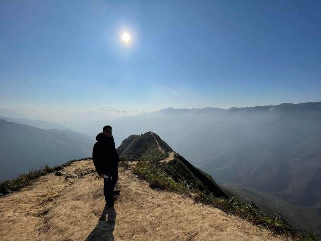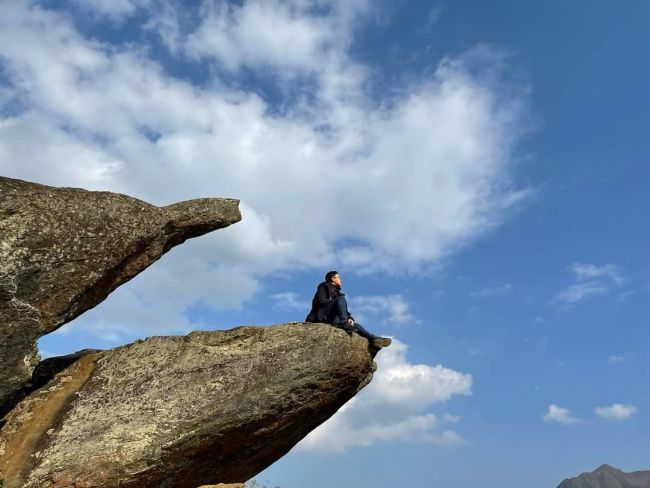 – Sống lưng khủng long: Dãy núi nhìn từ xa giống như sống lưng của khủng long, là điểm xa nhất mà hai đứa mình đã đến, cách đó khoảng 20km. Đoạn đường đi có những phần hẹp và khó đi. Trên đường, hoa đào nở rực rỡ tại những nhà dân bên lề đường. Điểm này để lại ấn tượng sâu sắc nhất. Trước chuyến đi, mình đã đọc review và biết rằng để đến sống lưng, có thể đi bộ hoặc thuê xe ôm. Nhưng thực tế chỉ có một cách để đến gần cuối đó là đi bằng xe ôm (50k/người/2 chiều). Xe ôm được lái bởi các thanh niên người Mông với tay lái siêu lụa và lòng gan siêu mạnh. Đoạn đường cuối 1km đến sống lưng đòi hỏi sự nín thở và một chút trò chuyện với người lái xe ôm (điều tò mò nhất là bạn này sinh năm 92 nhưng lấy vợ từ khi mới 16 tuổi, với đứa con lớn đã học lớp 7, tự nhận mình già nhưng mình bảo sinh năm 90 vẫn bảo “ô chị vẫn trẻ mà”).