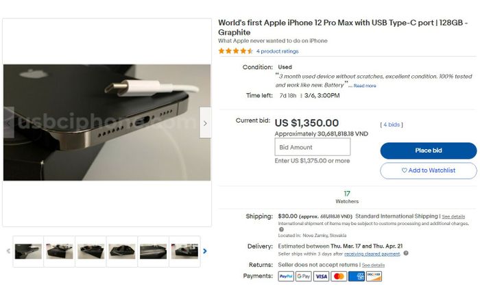 Đấu giá cho sản phẩm này đang diễn ra trên eBay với giá khởi điểm là 1.350 USD. Cuộc thi bắt đầu từ thứ Năm và sẽ kết thúc vào lúc 3 giờ sáng theo giờ ET vào ngày 6 tháng 3.Đây không chỉ là chiếc iPhone 12 Pro Max đầu tiên trên thế giới được trang bị cổng USB-C, mà còn là chiếc thứ hai trên thị trường. Điều này thực sự là một bước tiến lớn trong công nghệ di động.