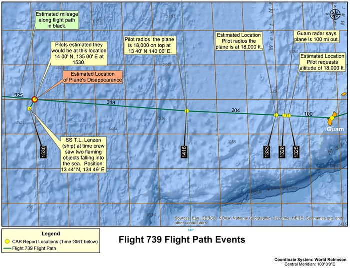 13:25 GMT, phi hành đoàn trên chuyến bay 739 liên lạc với trạm dịch vụ bay quốc tế tại Guam (Guam IFSS), yêu cầu leo lên độ cao 18000 ft từ 10000 ft. Guam IFSS đã chấp thuận yêu cầu này mặc dù không rõ lý do là gì khiến phi công yêu cầu thay đổi độ cao hành trình. Vào 13:28 GMT, phi công thông báo đã vượt mốc 11000 ft và tiếp tục leo, trạm Guam cũng thông báo với phi công rằng ở cự ly 160 km về phía tây của Guam, radar sẽ không còn phát hiện được máy bay. Đến 13:33 GMT, phi hành đoàn báo cáo với trạm Guam rằng họ sắp vượt ra khỏi ranh giới 160 km ra khỏi đảo Guam và đang bay ở độ cao 18000 ft.