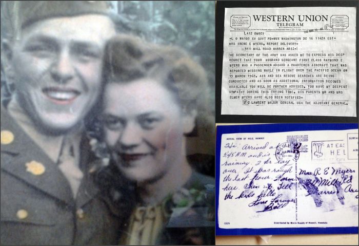 Trung sĩ Raymond 'Bill' Myers và vợ Irene Myers. Ông là một trong số 107 người mất tích trên chuyến bay 739. Trong khi chiếc máy bay dừng ở Honolulu, ông đã gửi một lá thư tới gia đình ở Hawaii với lời nhắn: 'Gửi lời chào của tôi đến các con. Yêu các con mãi.' Góc trên của bức thư mà bà Irene Myers nhận được thông báo rằng chồng bà đã mất tích trên chuyến bay.