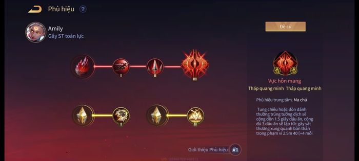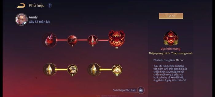 Phụ kiện Ma TínhVới phụ kiện xoay quanh trung tâm Ma Tính, Amily có thể tối ưu hóa sát thương bằng cách spam chiêu và sử dụng các kỹ năng thêm một lần nữa khi sử dụng chiêu cuối. Điểm đặc biệt của Ma Tính là khả năng kéo dài hiệu ứng khi hạ hoặc phụ, điều này giúp Amily mạnh mẽ hơn trong giao tranh. Về khả năng chí mạng, phần quan trọng nằm ở phụ kiện Bí Quyết của nhánh phụ, cho phép Amily nhận thêm 16% chí mạng gia tăng, tăng cường khả năng gây sát thương.