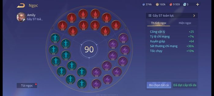 Bảng ngọc cho AmilyĐây là bảng ngọc phù hợp nhất dành cho Amily với phong cách nửa chí mạng nửa công. Khi sử dụng bộ ngọc này, Amily sẽ có 7% tỷ lệ chí mạng và đặc biệt là 36% sát thương chí mạng, giúp cô nàng có khả năng gây ra sát thương chí mạng mạnh mẽ hơn khi kết hợp với các trang bị khác có chí mạng. Ngoài ra, bộ ngọc này còn cung cấp 25 chỉ số công vật lý và 64 chỉ số xuyên giáp, giúp Amily gây ra sát thương ổn định hơn ở giai đoạn đầu của trận đấu.