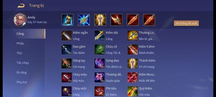 Trang bị chí mạng - công cho AmilyDưới đây là trang bị phù hợp nhất cho Amily theo phong cách nửa chí mạng nửa công. Tổng cộng, trang bị này mang lại 65% tỷ lệ chí mạng cho toàn bộ (bao gồm cả phụ kiện và bảng ngọc). Với chỉ số này, Amily có thể tạo ra sát thương cực mạnh, khi chỉ có 2 món 'trấn phái' như Khoan Chuyển Động và Thần Kiếm.