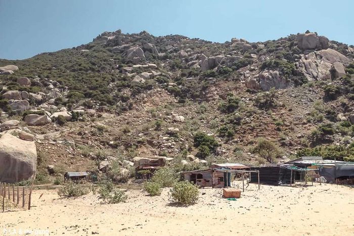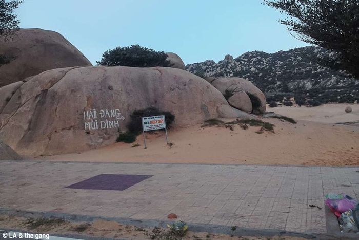 Vượt qua khu vực Đầm Cà Ná, chúng tôi tiếp tục chạy đến Mũi Dinh. Khi bạn đến khu vực nhập cảng Mũi Dinh, bạn sẽ thấy hàng quán ở bên trái và một tảng đá lớn với chữ Hải Đăng Mũi Dinh ở bên phải. Chạy thêm một đoạn, vòng lại để gửi xe. Chỗ nào cũng được, chúng tôi chọn quán Hà. Giữ xe trong sân (10.000 VND / chiếc) và bạn có thể gửi đồ và nón bảo hiểm vào trong nhà.