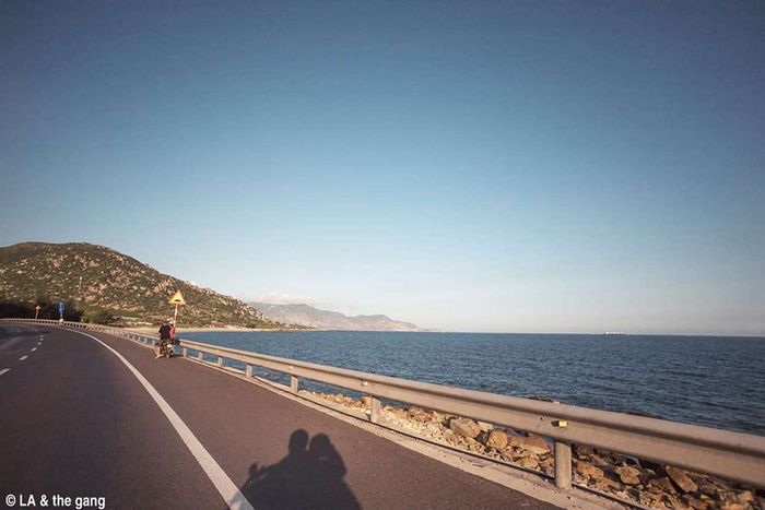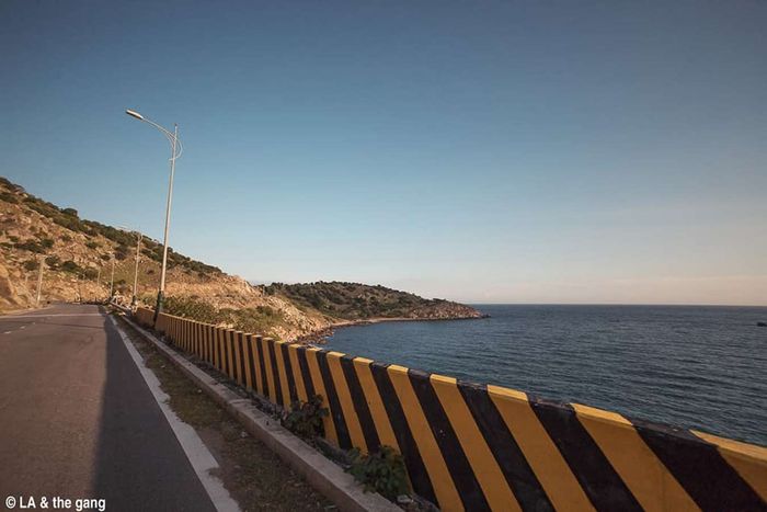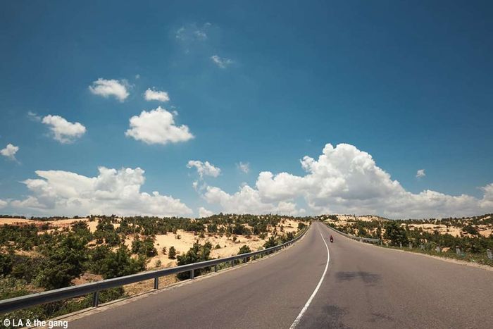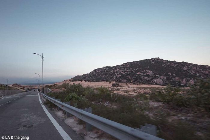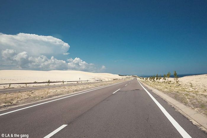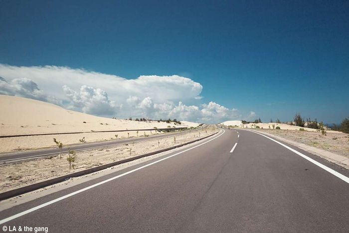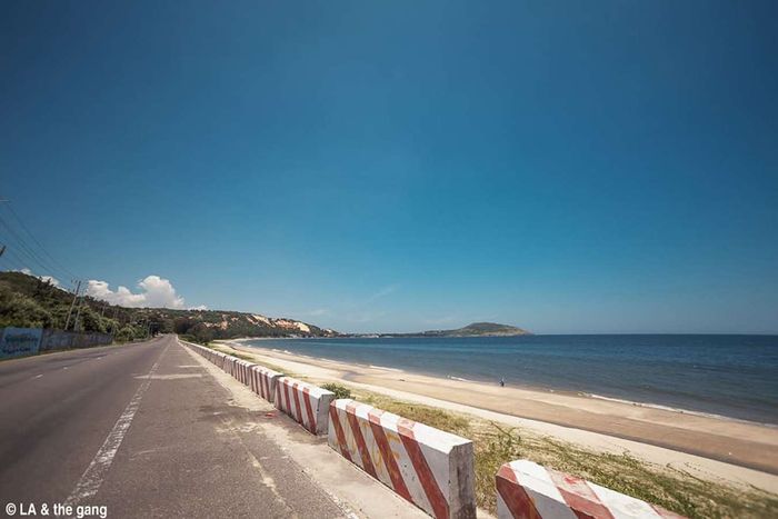 Sau khi rời Mũi Né, bạn sẽ bị cuốn hút bởi vẻ đẹp biển xanh trải rộng. Nếu bạn chưa từng trải nghiệm cảm giác lái xe máy với một bên là biển, đây là cơ hội để thực hiện ước mơ đó. Đi qua bãi biển xanh ngắt, bạn sẽ đến đoạn đường dốc, tận hưởng toàn cảnh thiên nhiên đặc trưng của vùng đất gió cát Bình Thuận với những bãi cát bao la và những cụm cây lùm cây bụi.