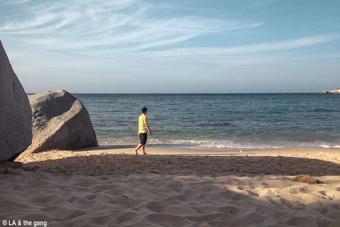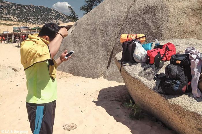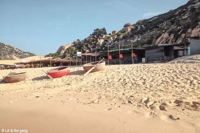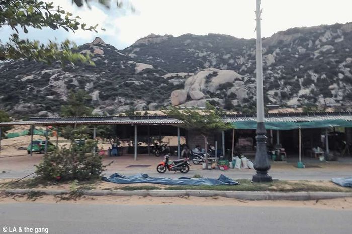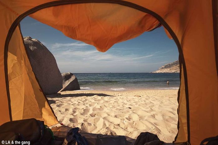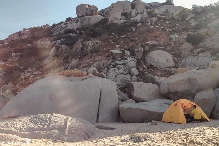 Trong khu vực này có một số quán ăn, nước uống, đá, và cơ sở vệ sinh (5.000 VND/lần), cũng như có dịch vụ cho thuê lều. Khi chúng tôi đến, trời đã tối, không thể tận hưởng biển nhưng chọn một góc với những tảng đá (mặc dù có chút rác, nhưng có lẽ nhiều người cũng đã cắm trại ở đây) và dựng lều dưới ánh đèn pin.