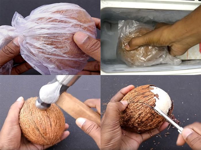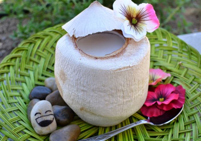 – Sử dụng chiếc dao tinh tế để tạo một lỗ nhỏ trên miệng dừa và rót nước dừa ra. Sau đó, sử dụng rây để lọc sạch tất cả bụi bẩn. Chia nước dừa tươi thành 4 phần.