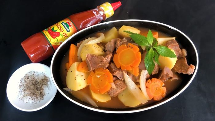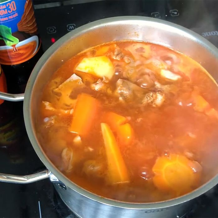 - Thêm 1,5 lít nước vào nồi, khi nước sôi, cho khoai tây vào hầm mềm. Tiếp theo, thêm cà rốt vào hầm chung, nêm nếm gia vị sao cho vừa ăn.