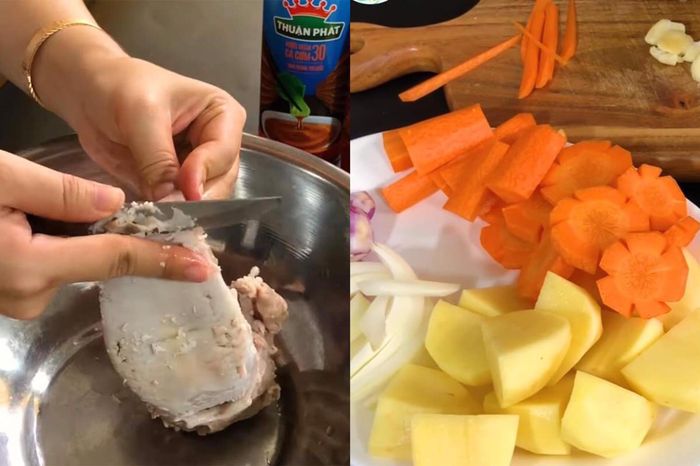 - Hành tây gọt vỏ, rửa sạch, thái thành múi cau. Cà rốt cạo vỏ, rửa sạch, cắt khúc hoặc tỉa hoa. Tỏi và hành tím bóc vỏ, băm nhuyễn.