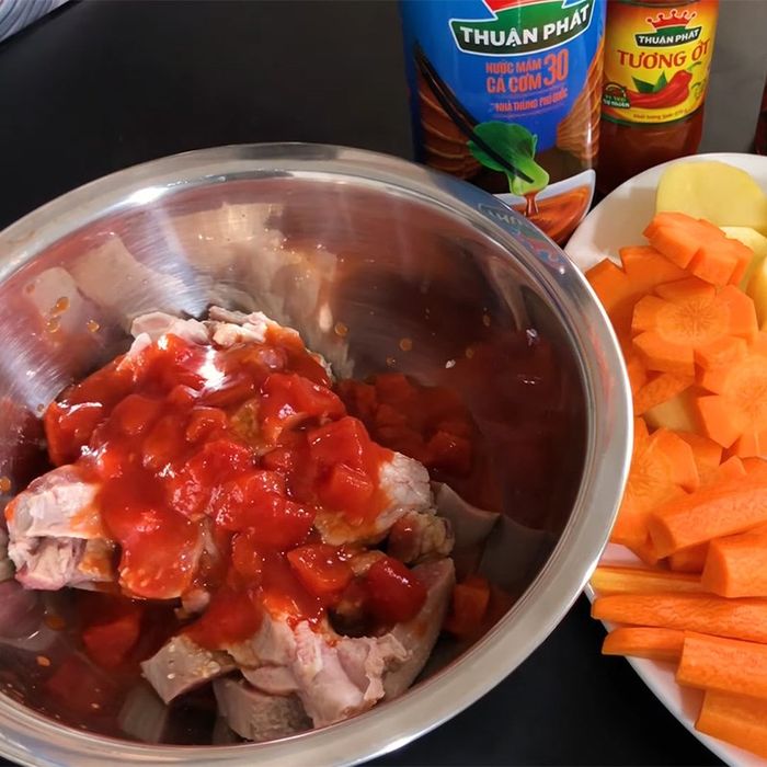 - Hỗn hợp ướp bao gồm: 1 thìa cà phê hạt nêm, 1,5 thìa cà phê đường, ½ thìa cà phê bột ngọt, 1 muỗng canh tương ớt, ½ muỗng canh nước mắm, 100g cà chua hộp. Trộn đều tất cả.
