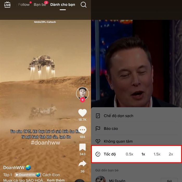 Bước 2: Mở ứng dụng sau khi đã cập nhật. Để điều chỉnh tốc độ video, giữ ngón tay vào video. Xuất hiện nhiều tùy chọn, chọn Tốc độ và lựa chọn 0.5x, 1x, 1.5x, hoặc 2x tùy theo ý muốn của bạn.
