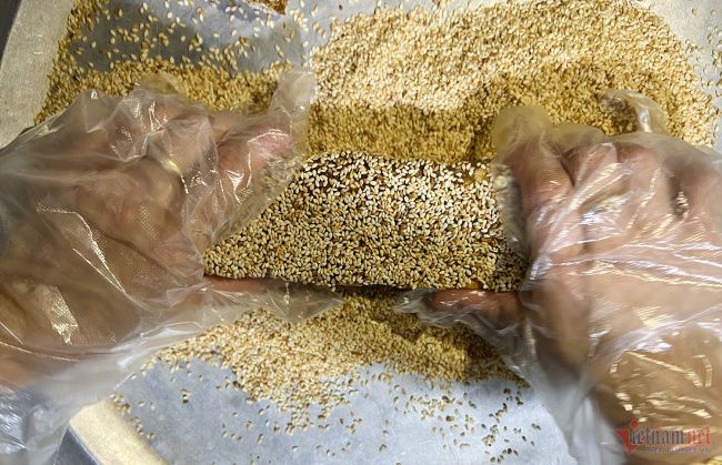 Bánh ong được cắt từng khuôn và lăn đều để hạt vừng bám chặt. Nguồn: vietnamnet.vn.