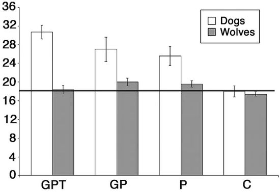 Đối với giả thuyết thứ hai, các nhà nghiên cứu đã thực hiện thí nghiệm trên 'người họ hàng gần' của chó, chó sói. Nếu tỷ lệ chính xác giữa chó sói và chó tương đương, điều đó có nghĩa là khả năng đọc hiểu ý muốn của con người có thể đến từ tổ tiên chung của chó và chó sói.