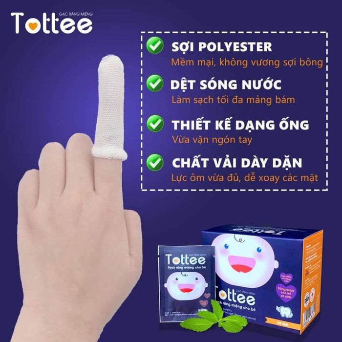 Gạc rơ lưỡi Tottee dùng cho trẻ từ 0 tháng, trẻ gặp các vấn đề liên quan đến răng miệng, trẻ chưa thể tự vệ sinh răng miệng. Sản phẩm được bán theo hộp, mỗi hộp 30 cái, được bán với giá khoảng 85.000vnđ.