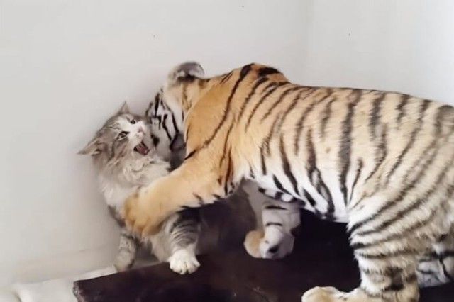 Trong thế giới động vật, chú hổ gặp phải trở ngại không ngờ khi đụng độ với mèo nhà