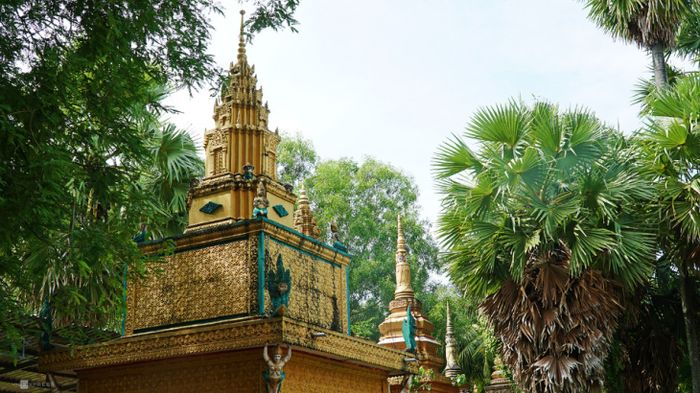 Bên ngoài điện chính là những dãy tháp chứa cốt của Phật tử, che chở dưới tán cây thốt nốt. Các ngôi tháp mang nhiều kích thước khác nhau, phản ánh điều kiện kinh tế của từng gia đình.