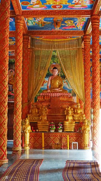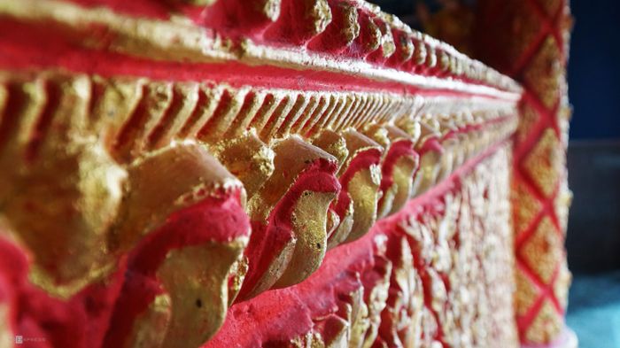 Xung quanh tượng Phật, những chi tiết chạm trổ sáng tạo với màu sắc độc đáo tạo nên một không gian tinh tế.
