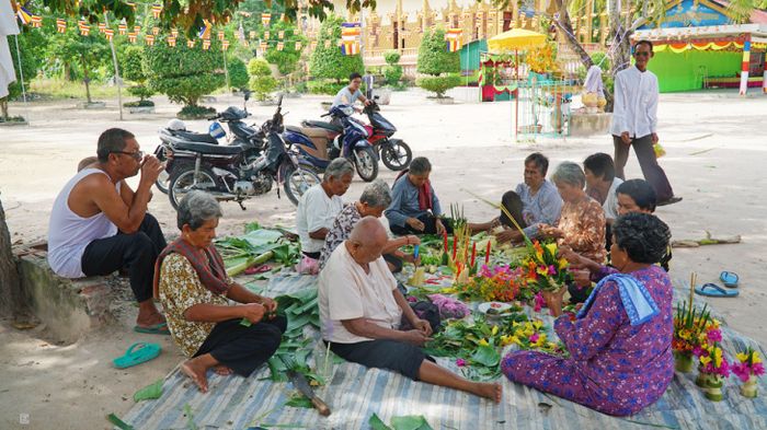 Theo truyền thống của người Khmer, vào mỗi dịp lễ hội hoặc những dịp đặc biệt, cả cộng đồng và Phật tử đều đến chùa để tham gia các nghi lễ. Trong hình là hoạt động làm hoa thủ công từ bắp chuối, được sử dụng để trang trí trong lễ khánh thành gian nhà mới của chùa.