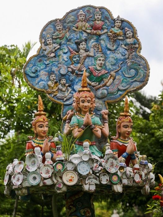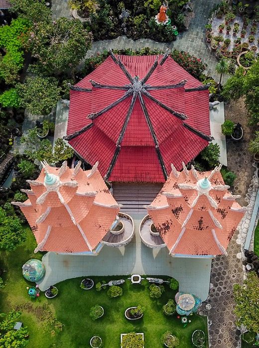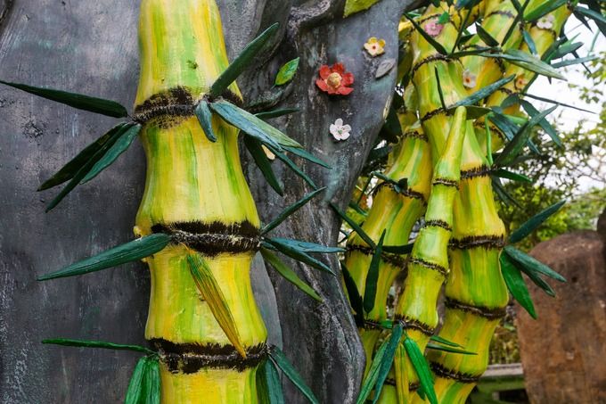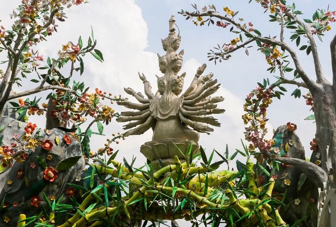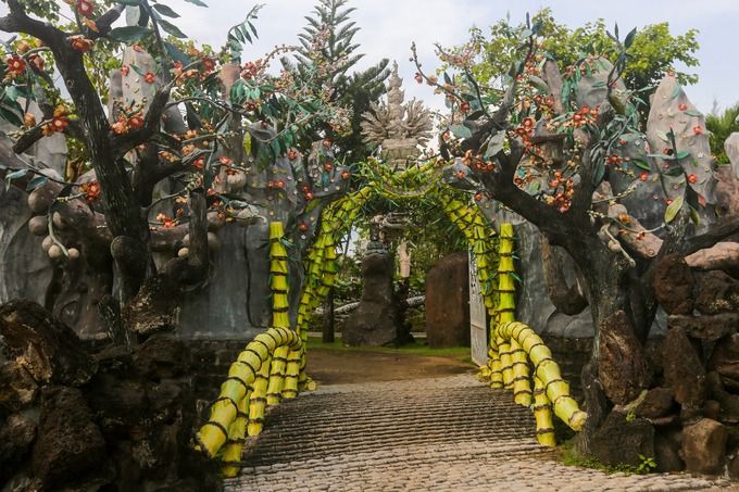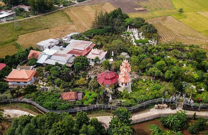 Chùa Ruộng Lớn với cổng chùa hình cây tre độc đáo, chánh điện kiểu bát giác, và khuôn viên trang trí bằng hàng nghìn khối đá với đủ hình thù độc đáo.